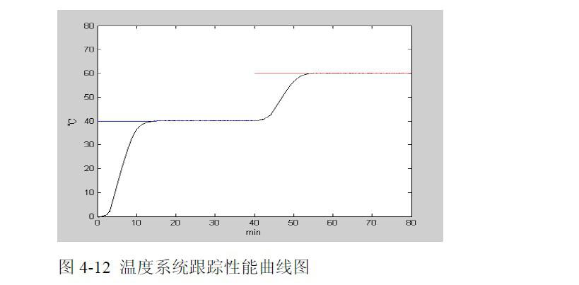 輸出變量經過模糊判決后輸出的控制量在0—1 之間,表示各個執行器的運行功率與運行功率的比值。采用對數型激活函數而沒有用模糊神經網絡的輸出直接作為最終輸出的目的是為了讓執行器能夠平滑過渡,減少磨損,延長使用壽命。環境試驗箱溫度系統仿真結果環境實驗箱在初始時刻設定跟蹤溫度為 40℃。在40 分鐘后設定為60℃。,誤差在2℃以外采用強制加熱或強制冷卻,在距離跟蹤目標的誤差在2℃以內啟動模糊控制策略,系統動態跟蹤性能如圖所示: