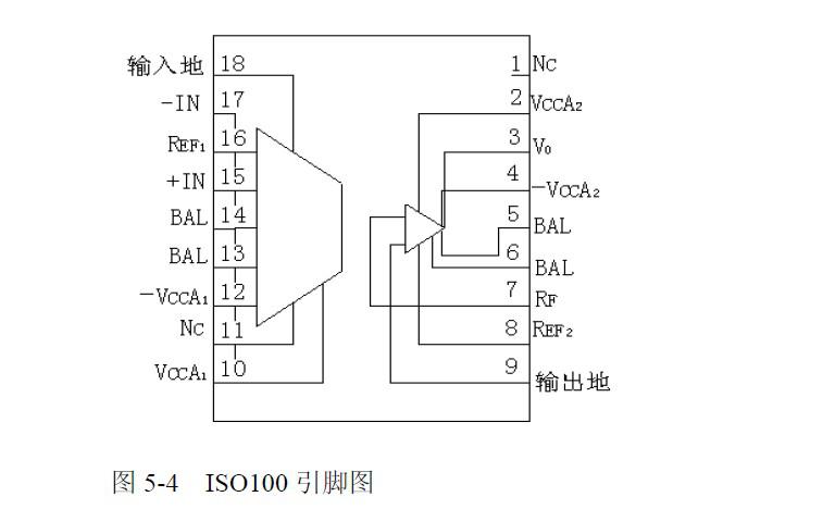 由于環境試驗箱的工作環境十分惡劣,因此輸入通道的各個環節中存在各種電磁干擾以及共模干擾等不良因素,會造成測量信號嚴重失真,系統不穩定等后果。特別是存在強電干擾時會直接影響系統的安全。為此,在輸入通道中常常采用信號隔離措施。常用的方法是采用隔離放大器。這是因為隔離放大器的線性和穩定性好,隔離電壓和共模抑制比高,應用電路簡單,頻帶較寬等。本設計中采用了ISO100光耦合隔離放大器保證前向通道的信號傳輸質量ISO100 是一種小型廉價的光耦合隔離放大器。其工作電源為±18V,隔離電壓2500V,輸入電流為±1mA,頻帶寬達60kHz,為18 引腳DIP 組件。引腳圖如圖5-4 所示: